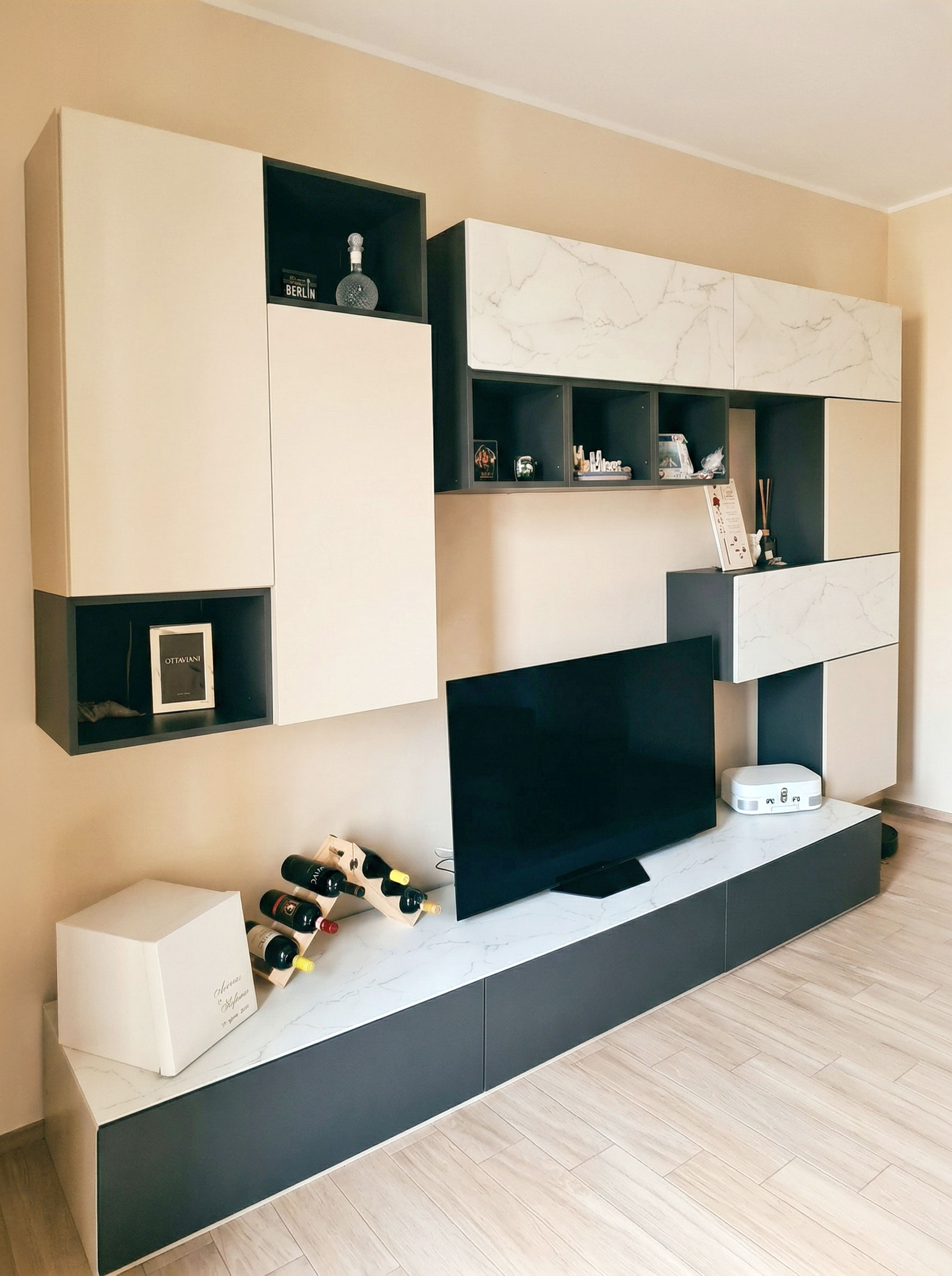 La zona living si distingue per una parete attrezzata dal design geometrico e armonioso, capace di unire funzionalità ed estetica in un gioco di volumi e contrasti che valorizza ogni spazio, rendendolo unico e personale.