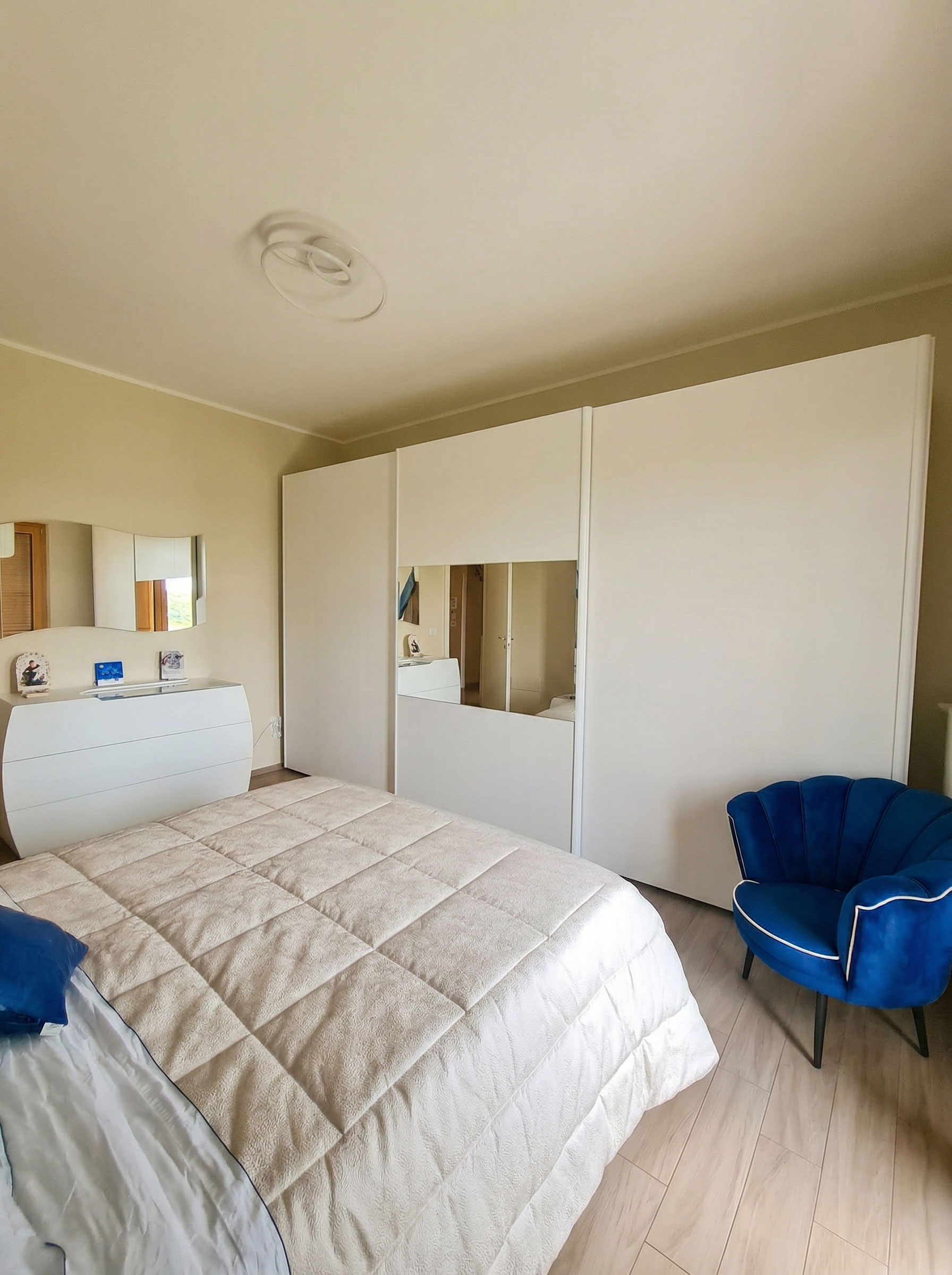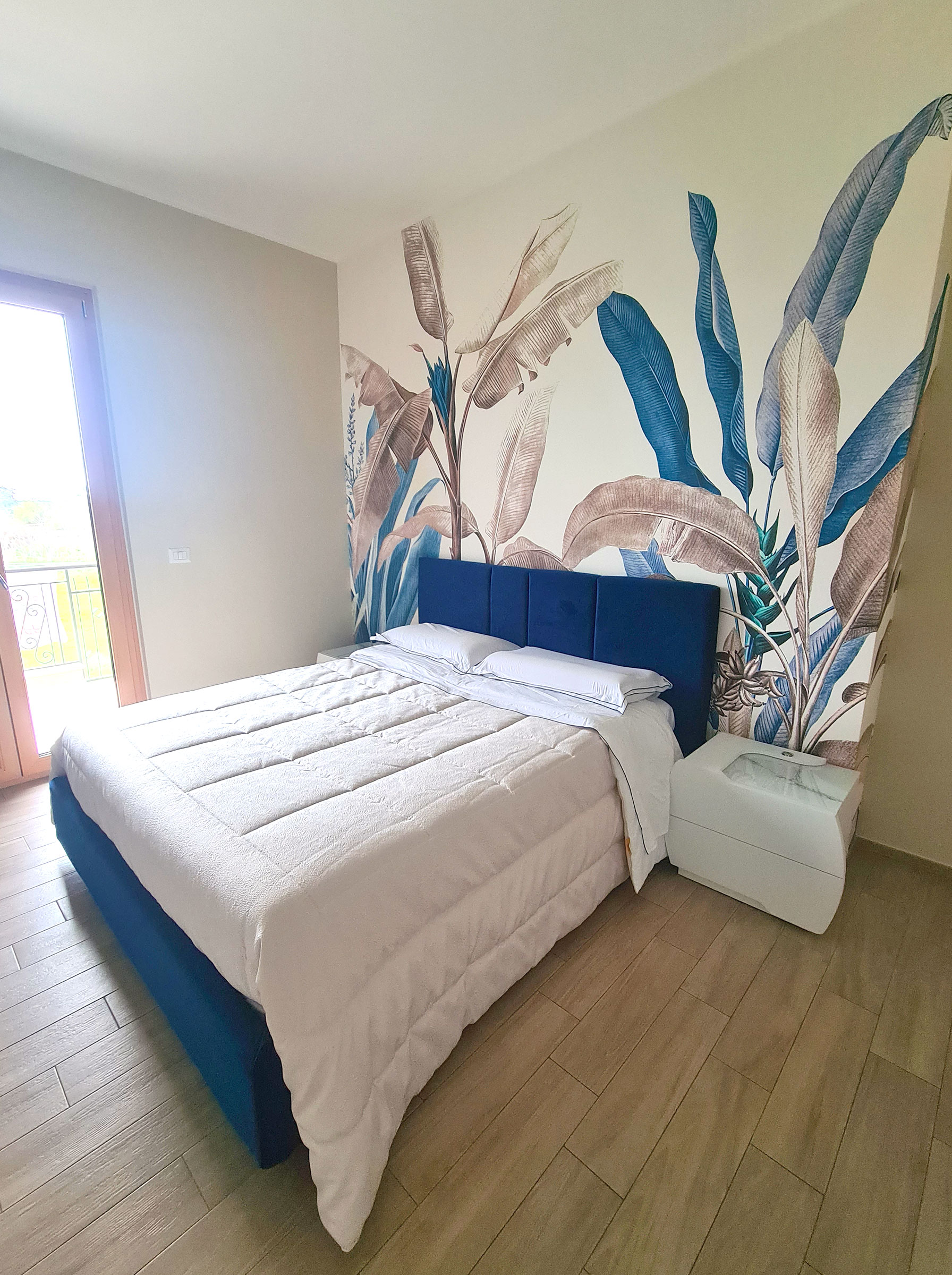 La zona notte, invece, racconta una storia di comfort e stile: la camera matrimoniale con carta da parati decorativa avvolge l’ambiente in un’atmosfera rilassante e suggestiva, mentre l’altra stanza, luminosa e ordinata, esprime tutta la bellezza della semplicità attraverso linee pulite e tonalità delicate, impreziosite da dettagli di carattere.